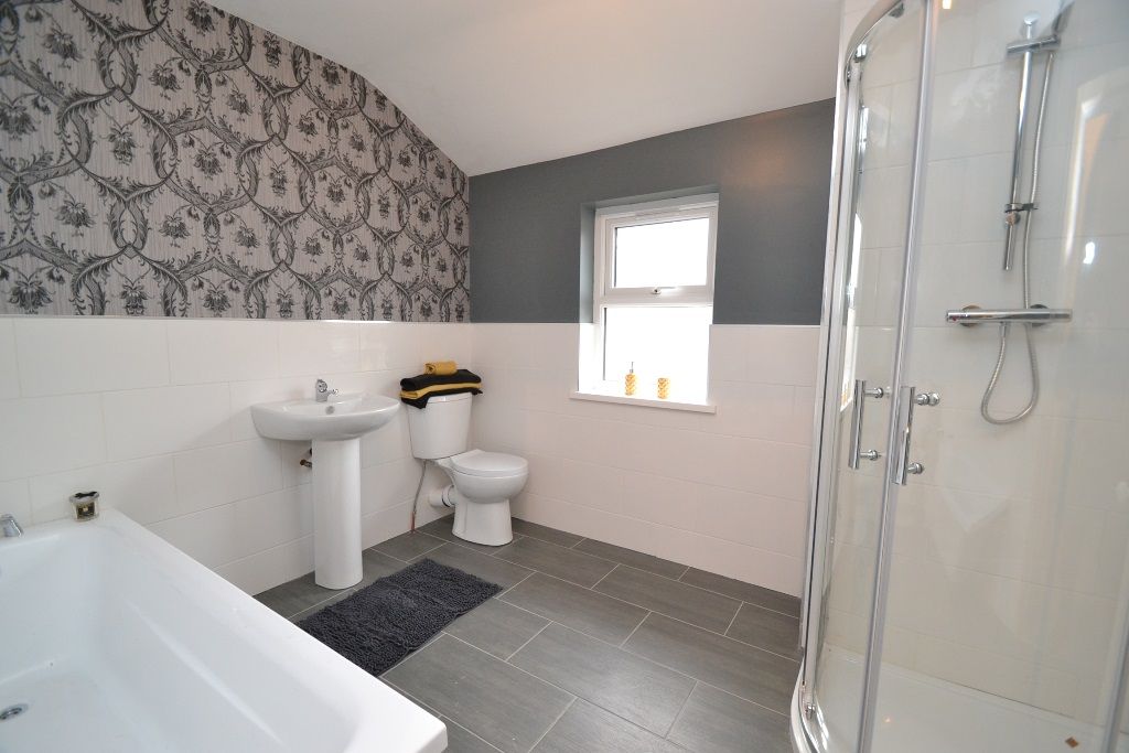 Family Bathroom: 2.98m x 2.51m (9'9 x 8'2). Four piece suite in white, part tiled, chrome fittings, wrap around shower cubicle with a chrome thermostatically controlled shower unit, heated chrome towel, rail frosted Upvc dg window.