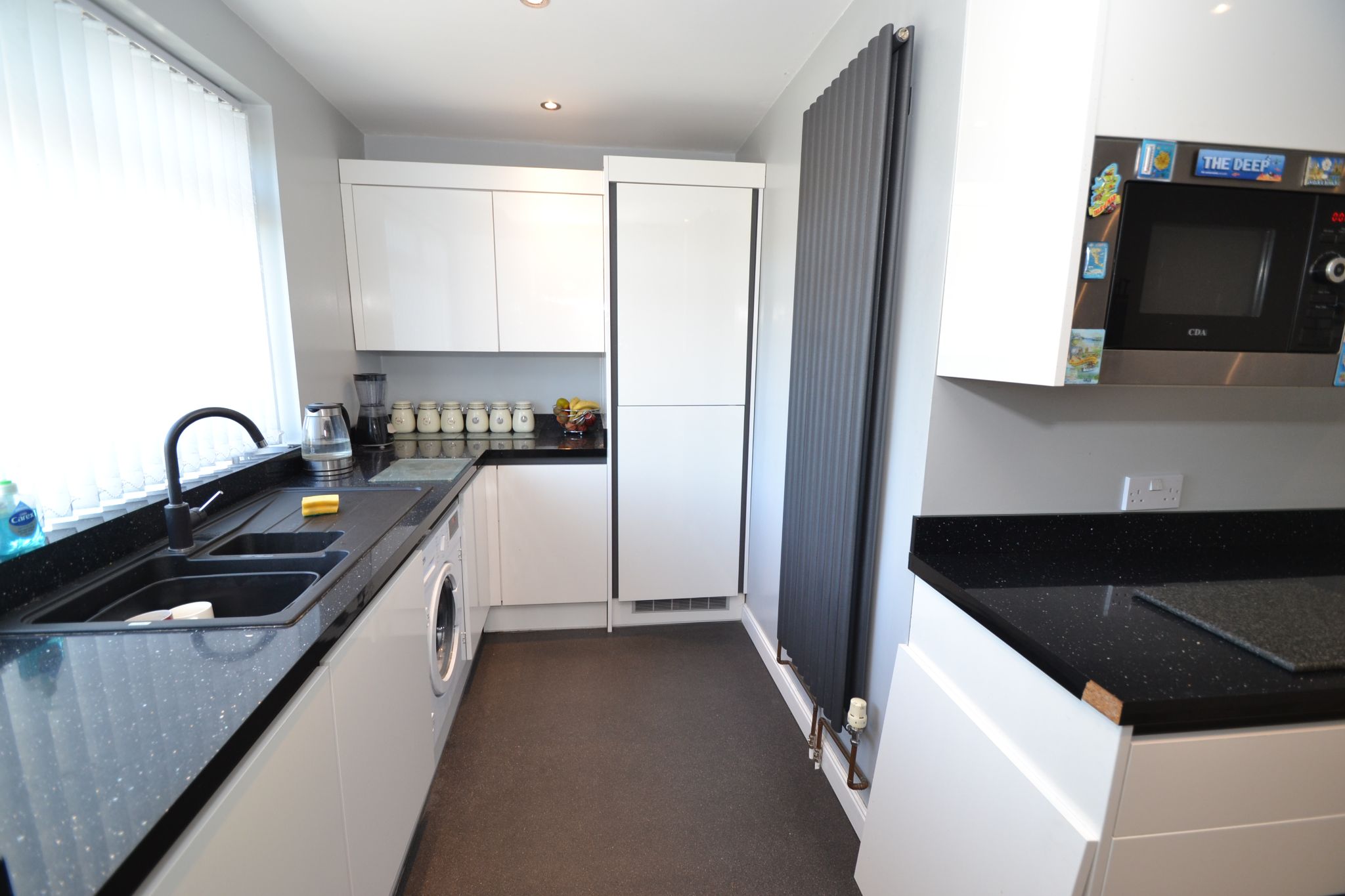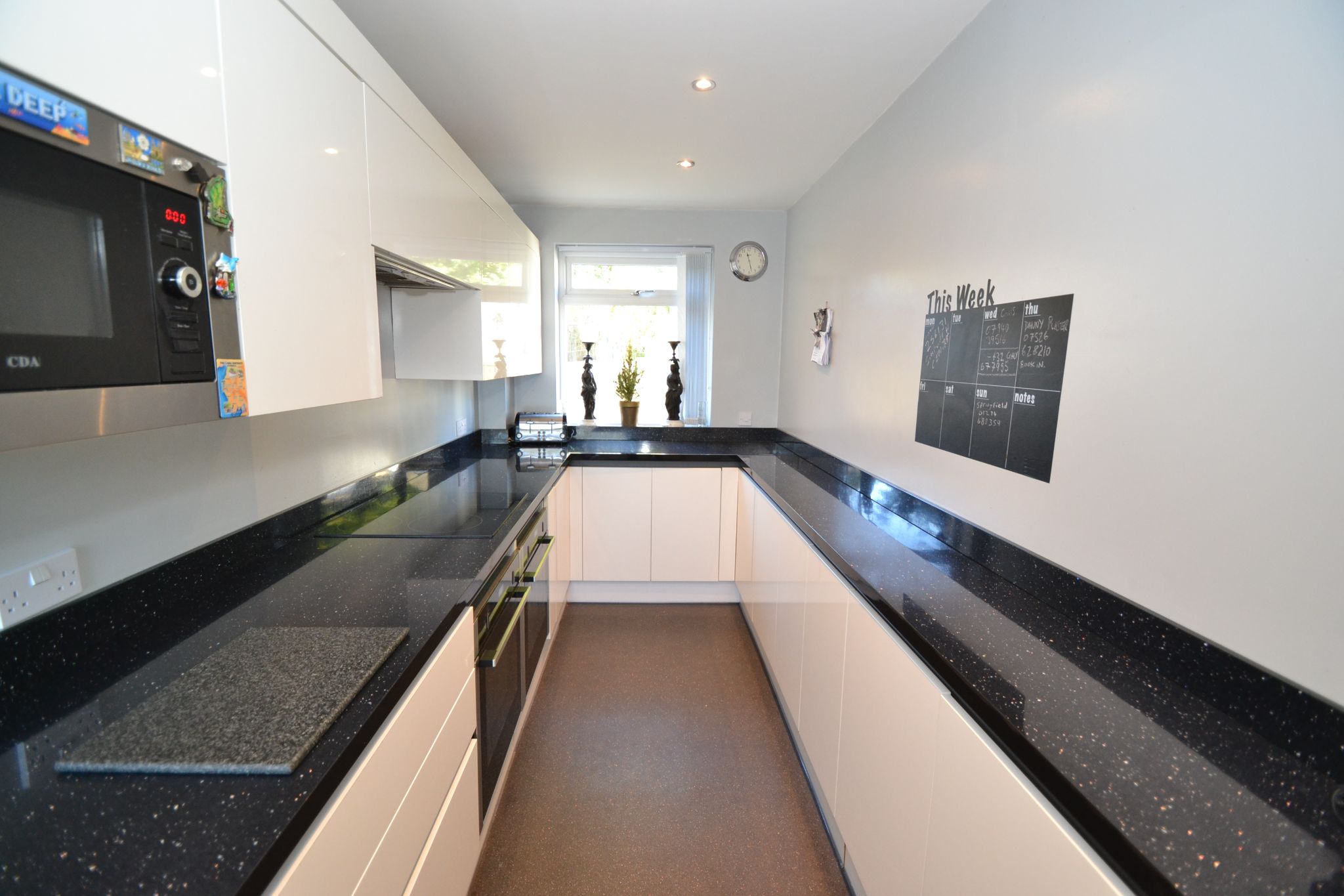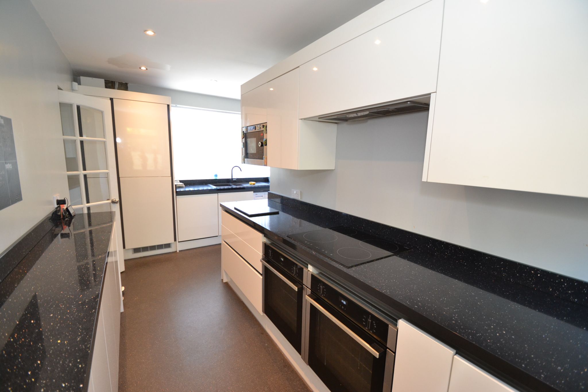 Kitchen: 5.50m x 3.95m (18'0 x 12'9). Extensive range of fitted wall & base units in high gloss white, marble effect work tops with matching splash backs, AEG extractor and light over a ceramic 4 ring hob, two built in electric ovens, built in microwave, integrated dishwasher and auto-washer, integrated large tall boy freezer, integrated fridge freezer, Upvc dg window to front, inset chrome ceiling lights, upright contemporary anthracite radiator.