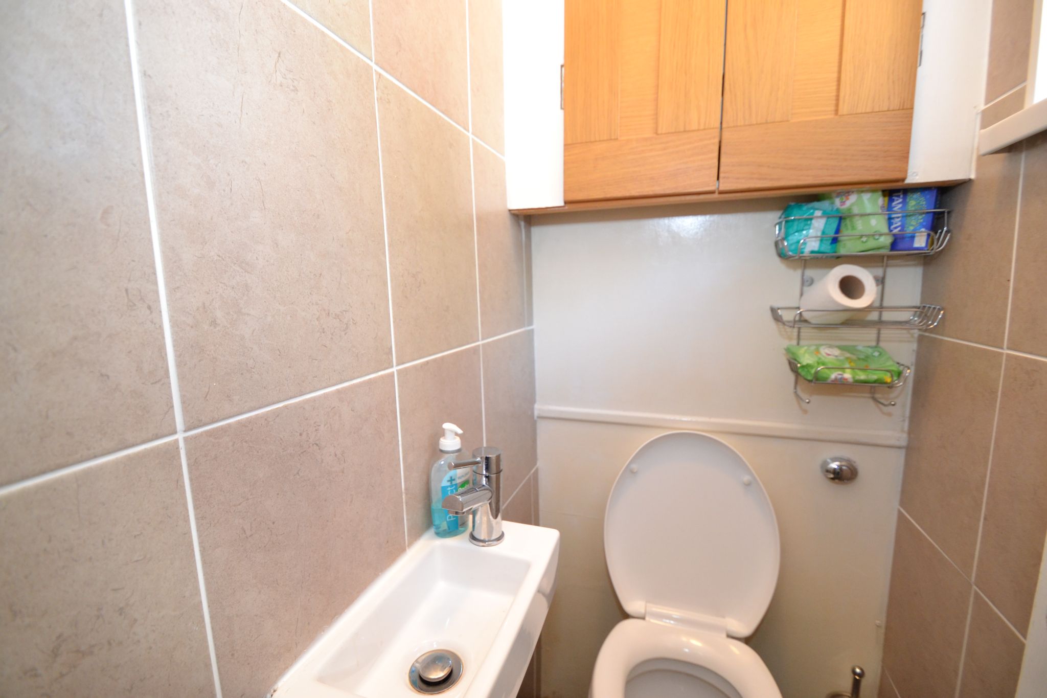 Cloaks: Wall mounted cupboard, fully tiled, wc and wash basin.