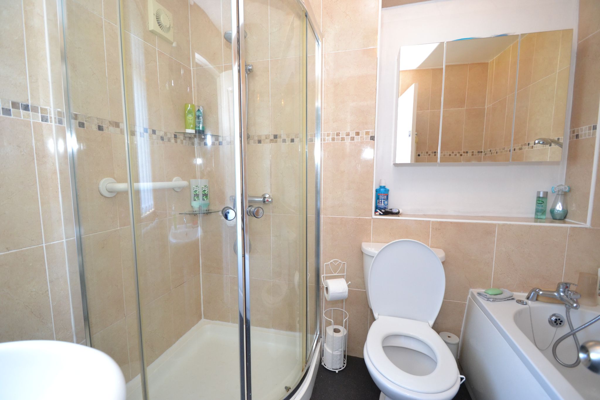 Family Bathroom: 2.39m x 1.71m (7'8 x 5'6). Three piece bathroom suite in white with chrome fittings, separate wrap around shower cubicle with a chrome thermostatically controlled shower unit, heated chrome towel rail, frosted Upvc dg window, wall vanity unit, extractor.