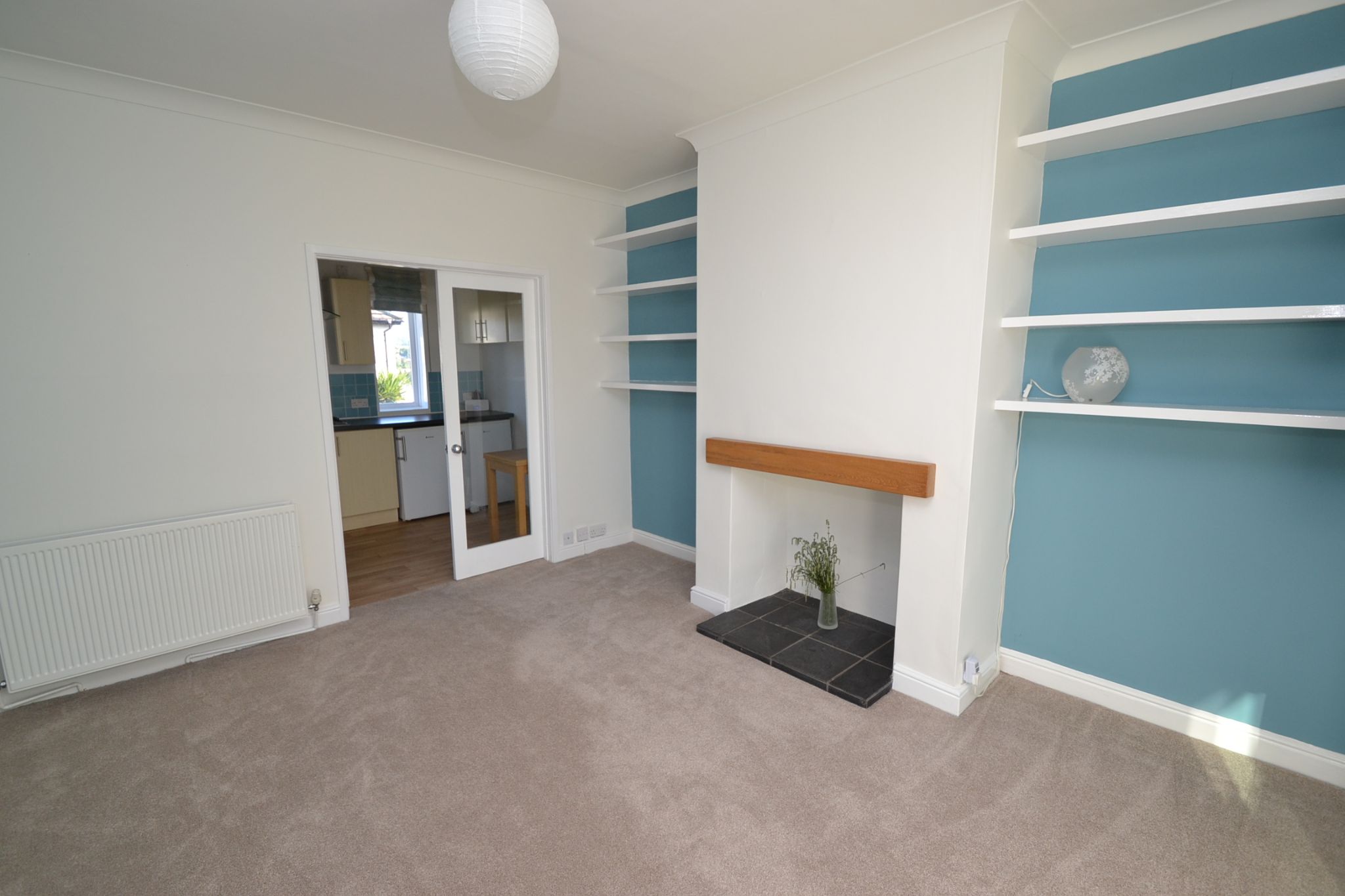 Bay Lounge: Upvc dg bay window to front, radiator, oak lintel with recessed display fireplace with a tiled hearth, built in shelving, coving.