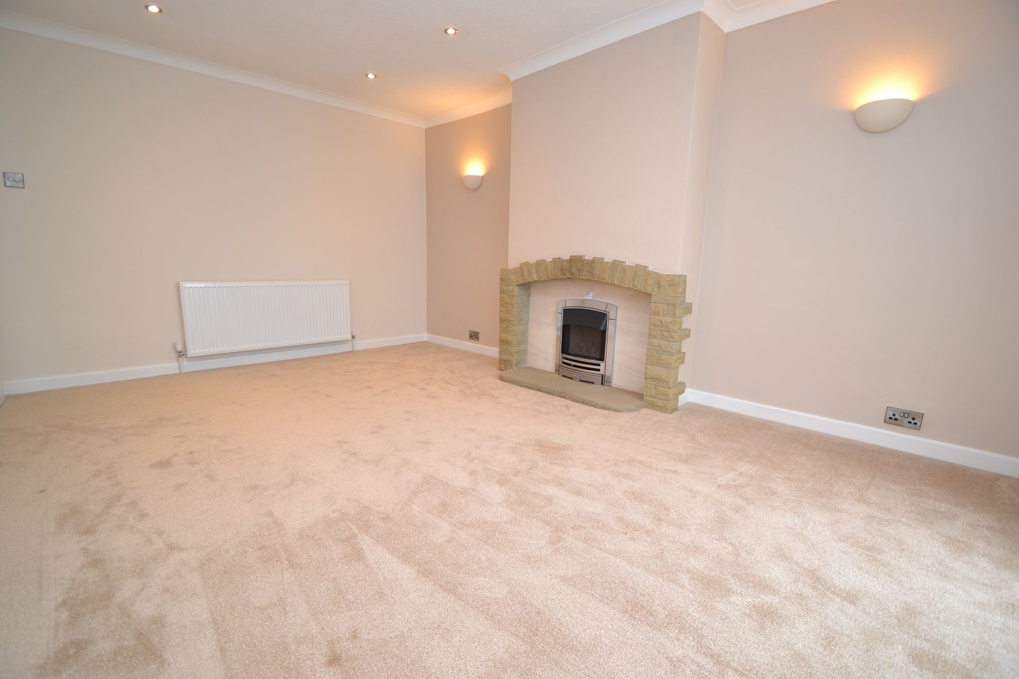 Lounge: 4.87m x 3.51m (15'9 x 11'5). Feature stone fireplace with a new living flame coal effect gas fire, coving, inset ceiling lights, radiator, newly installed Upvc dg French doors lead onto the:-