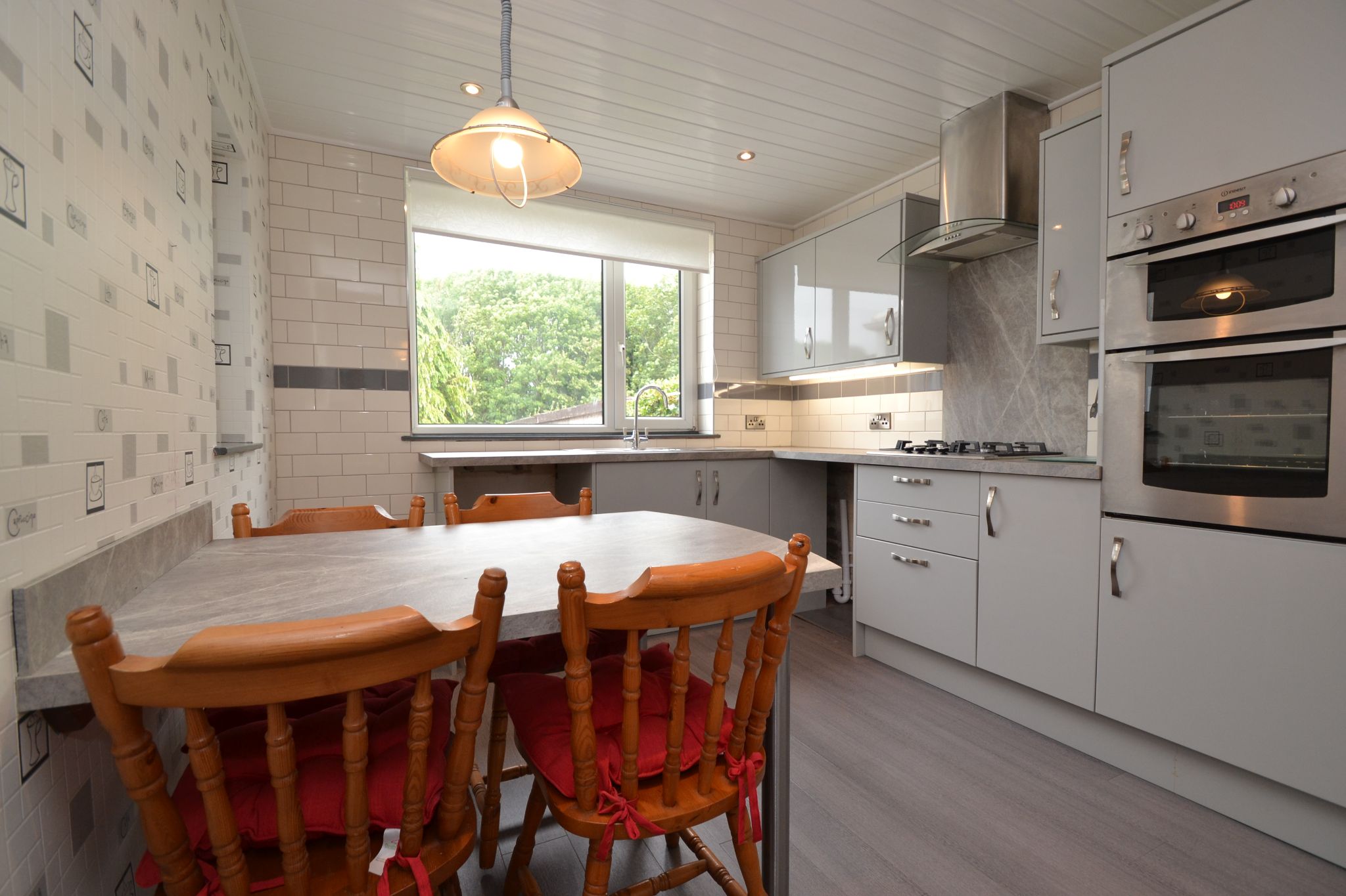 Breakfast Kitchen: 3.37m x 2.96m (11'0 x 9'7). Modern range of wall & base units in high gloss grey, work tops with contrasting brick effect tiling above, slate grey splash back with a stainless steel extractor over a 4 ring stainless steel hob, built in double electric oven in stainless steel, plumbed for an auto-washer and dishwasher, space for a fridge, stainless steel sink with a mixer tap, radiator, breakfast bar, side & rear Upvc dg windows with fitted blinds, Upvc cladded ceiling with lighting, space for a table and chairs.