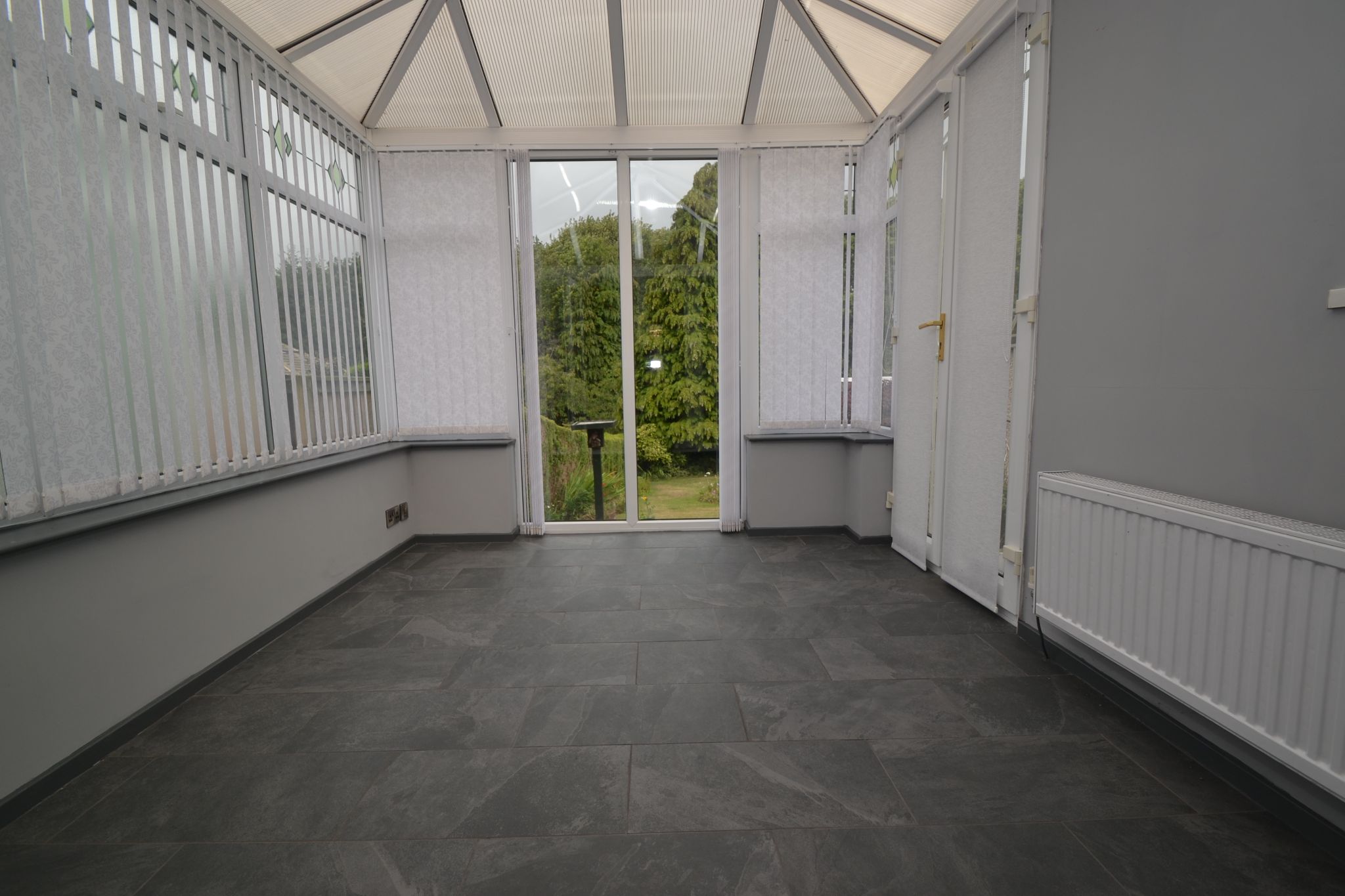 Conservatory: 4.21m x 2.88m (13'8 x 9'4). Radiator, new fitted blinds, newly tiled floor in slate grey, side French doors.
