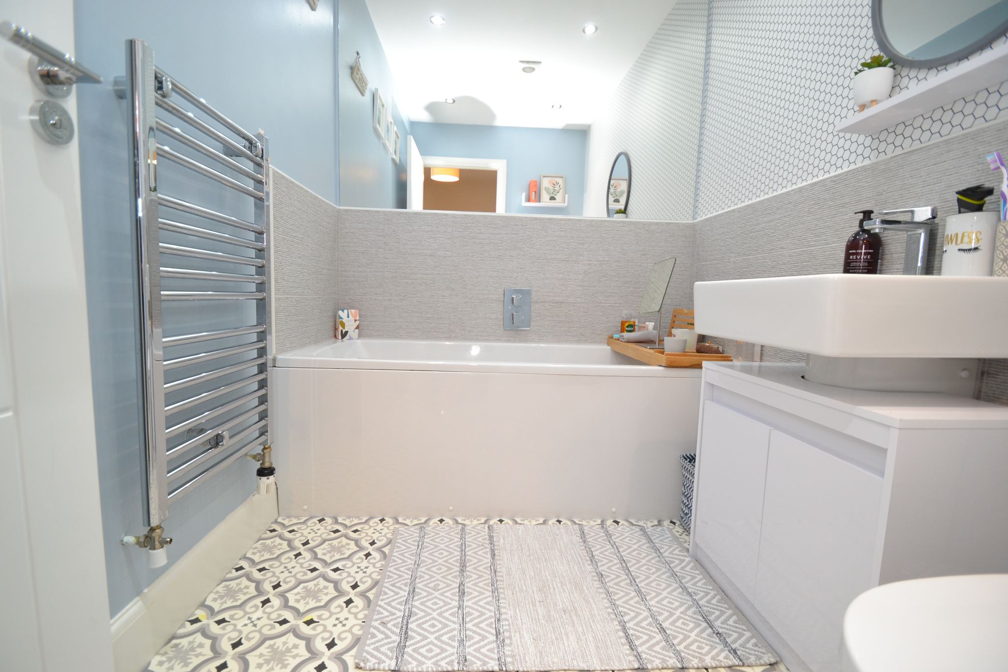 Bathroom: Three piece suite in white, part tiled, chrome fittings, wash basin set on a high gloss vanity unit, heated chrome towel rail, inset ceiling lights, extractor.