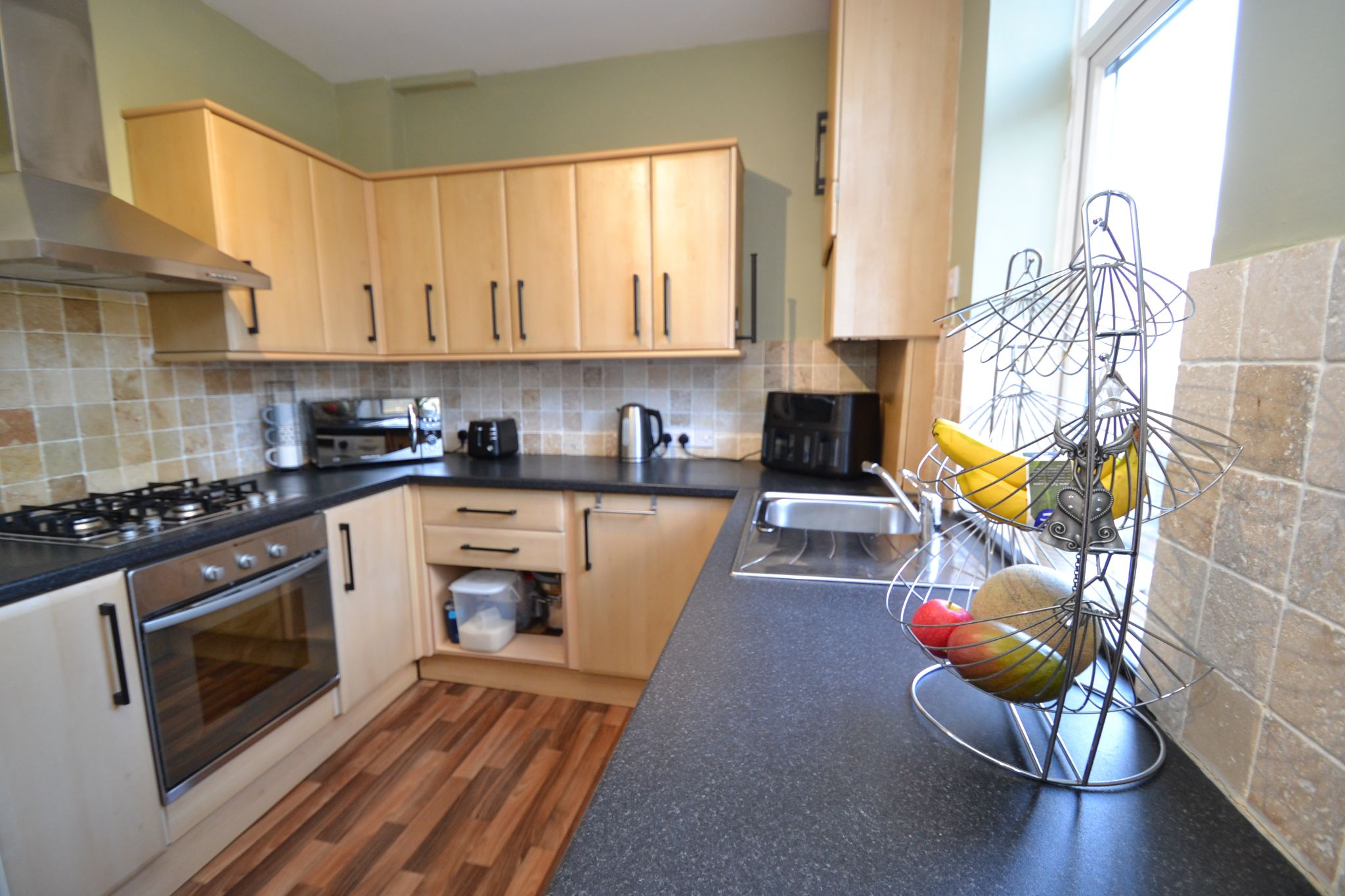 Kitchen Diner: 4.86m x 2.46m (15'9 x 8'0). Range of wall & base units in beech, granite effect work tops with rustic tiling above, stainless steel extractor hood over a 4 ring gas hob and built in electric oven all in stainless steel, plumbed for an auto-washer and dishwasher, stainless steel sink with a mixer tap, space for a tall boy fridge freezer, cupboard houses the Worcester Bosch condensing combi-boiler. Space for a table and chairs, double radiator, Upvc dg window and door to rear, internal door leads down into the:-