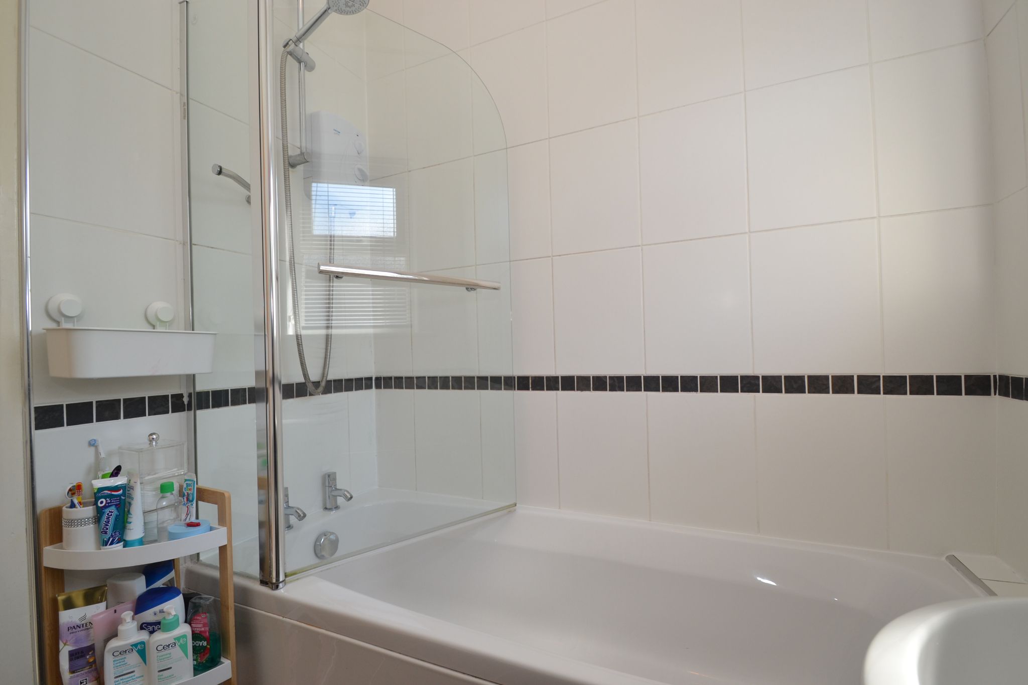 Bathroom: 1.82m x 1.77m (5'9 x 5'8). Three piece suite in white, shower glass screen, electric Triton Enrich shower over, fully tiled, frosted Upvc dg window, radiator, extractor.