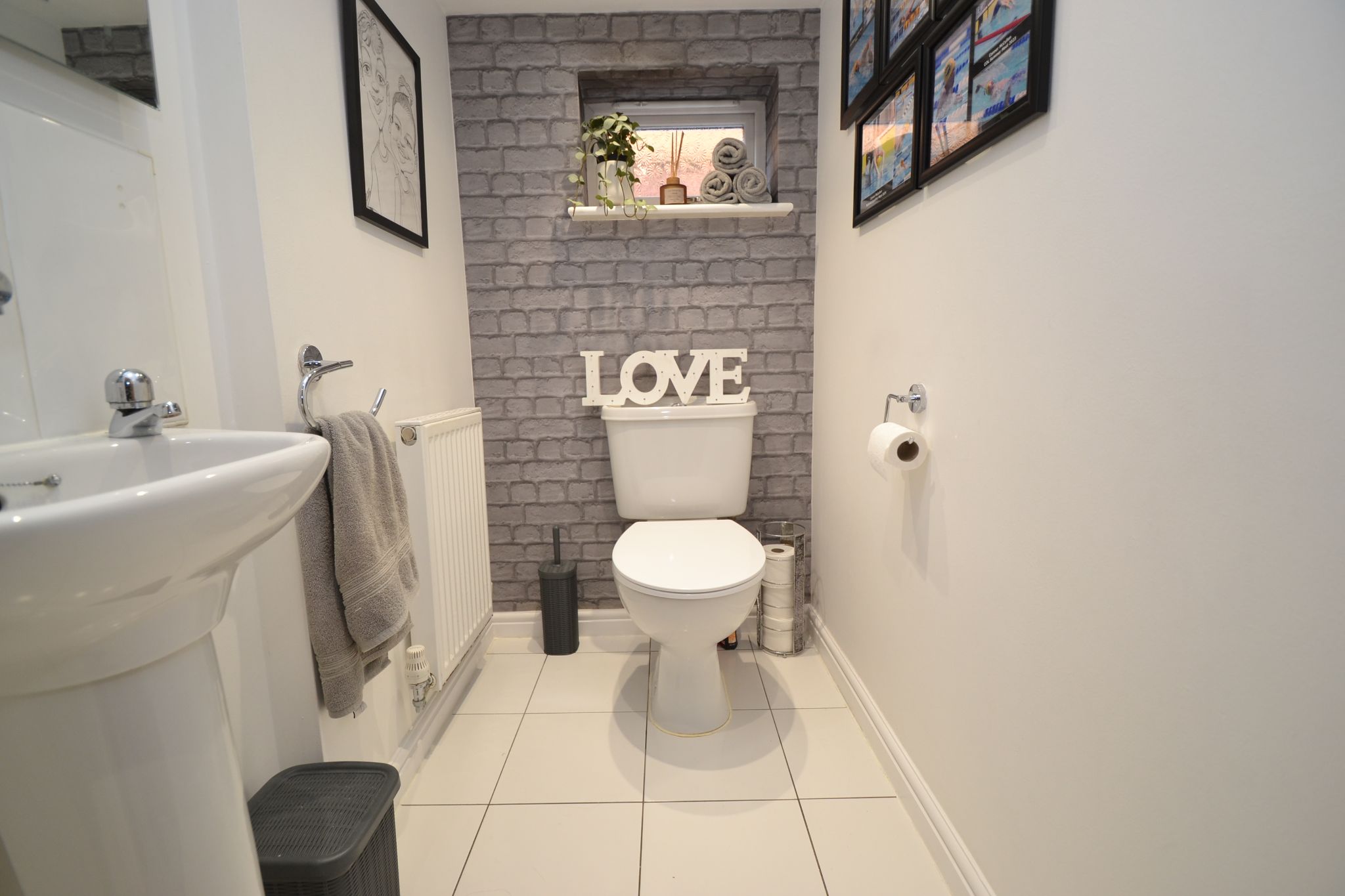 Cloaks WC: Wash basin and wc in white, tiled floor, frosted Upvc dg window, radiator, inset ceiling lighting, vanity wall mirror.