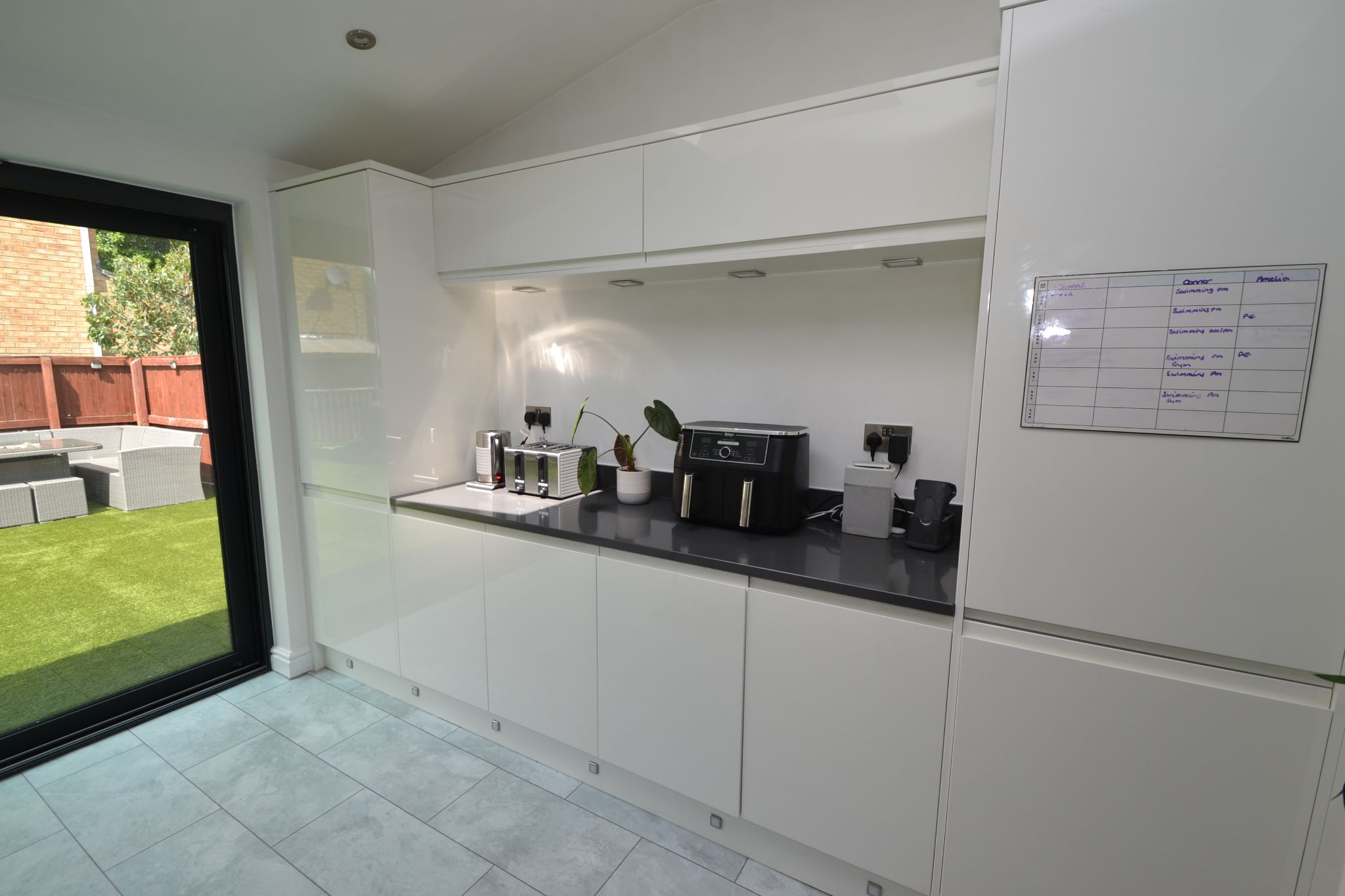 Open Plan Living Kitchen Diner: 7.77m x 6.76m (25'6 x 22'2). Excellent space offering a modern lifestyle to watch a flat screen TV, space for a large dining table and chairs, plus an extensive fitted kitchen in high gloss white with a large central island with a breakfast bar facility. The work tops have matching splash backs, under lighting and pelmet down lighting, inset ceiling lighting throughout, plinth lighting, integrated twin double electric CDA ovens and a microwave all in stainless steel, stainless steel 1.5 sink with a mixer tap, integrated tall boy fridge freezer. The large central island has a stainless steel extractor hood over a 5 ring CDA gas burner ceramic hob, wine cooler, breakfast bar, drawers and cupboard space, tiled floor, to the rear are large sliding patio doors, two sky light dg windows.