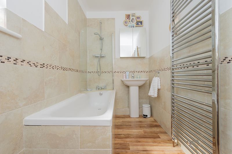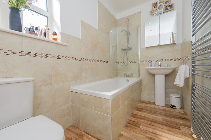 Bathroom: 2.88m x 1.50m (9'4 x 4'9). Three piece  suite in white, shower screen with a chrome thermostatically controlled shower unit over the bath, frosted Upvc dg mullion style window, extractor, inset ceiling lights, heated chrome towel rail, part tiled to the walls.