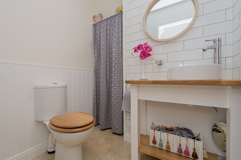 Cloaks: Low flush wc and wash basin in white, porcelain tiled floor with under floor heating, under stairs storage.