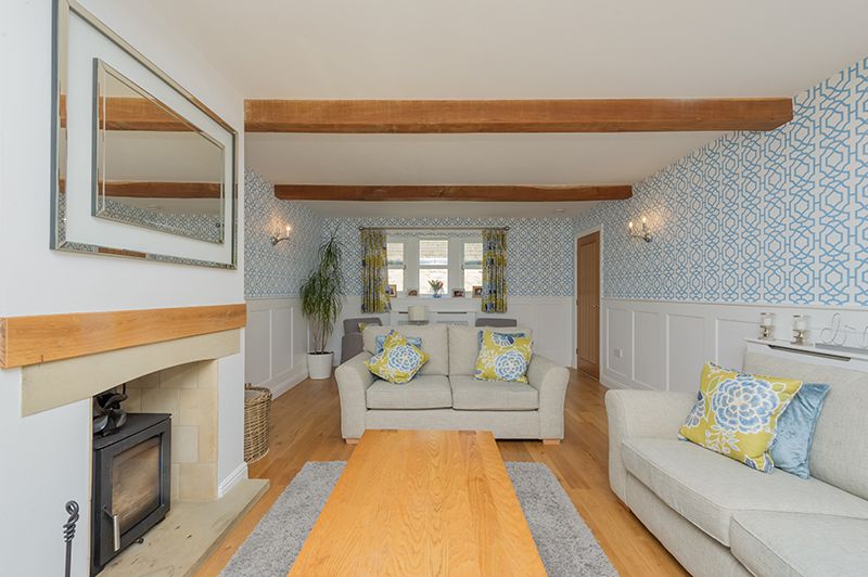 Lounge: 6.31m x 3.95m (20'7 x 12'9). Upvc dg mullion style windows to front, radiator, engineered wood floor, inglenook stone fireplace with an oak lintel over and a multi-fuel stove, beams, part painted panelling to walls, Upvc dg French doors to the rear.