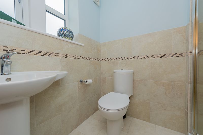 En-Suite: 2.03m x 1.76m (6'6 x 5'7). Fully tiled shower cubicle with a chrome thermostatically controlled shower unit, wash basin and wc in white, heated chrome towel rail, part tiled to walls, inset ceiling lights, frosted Upvc dg window, extractor.