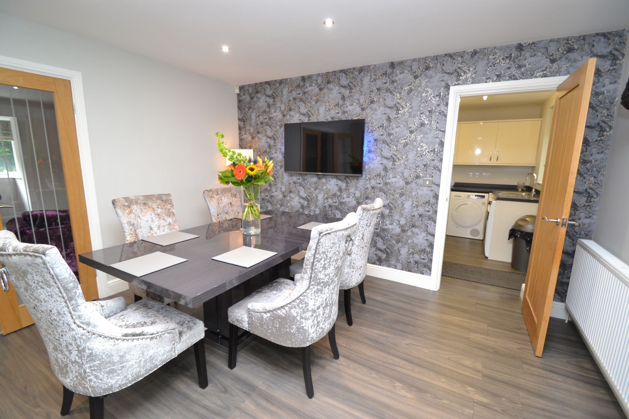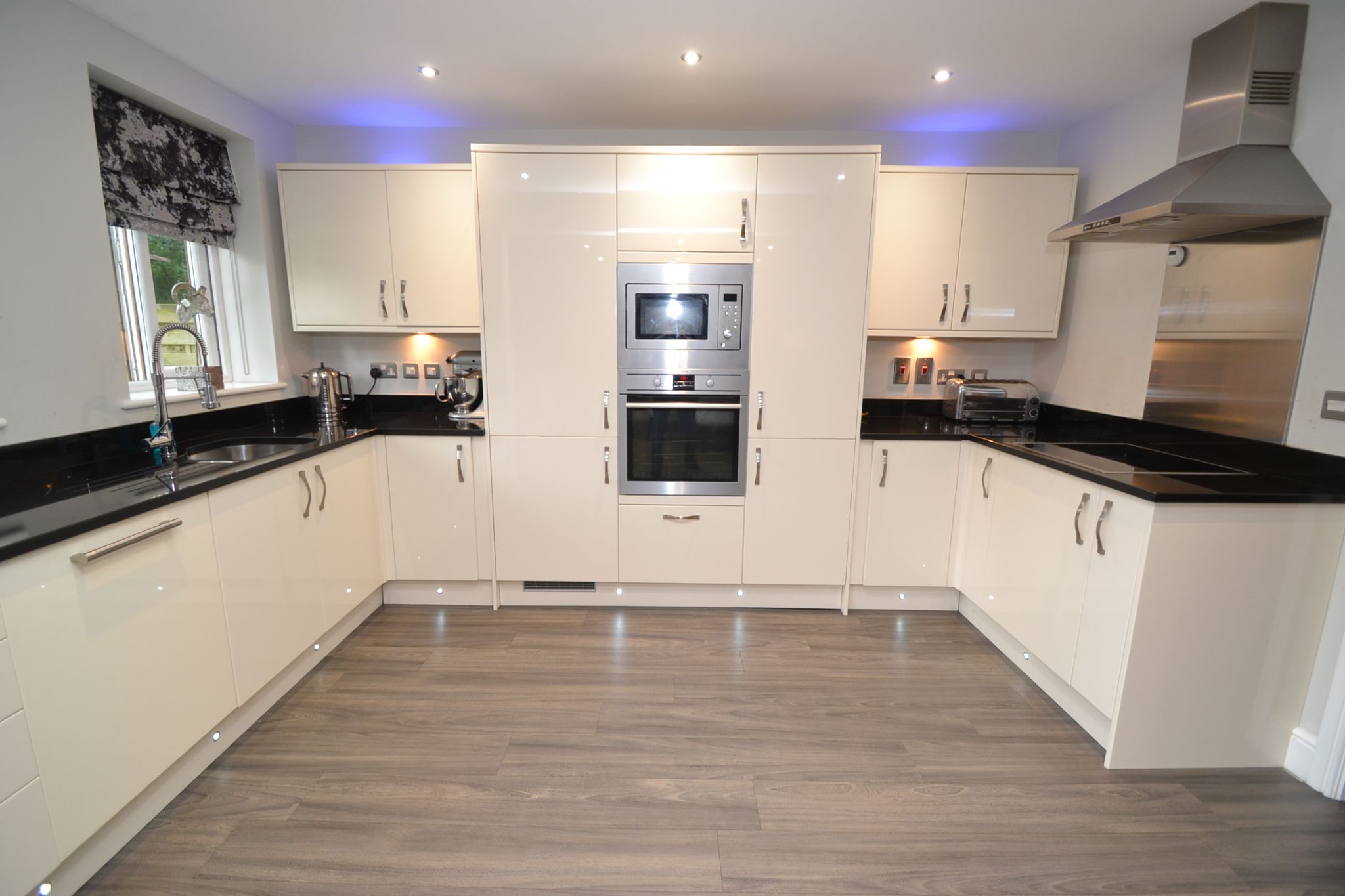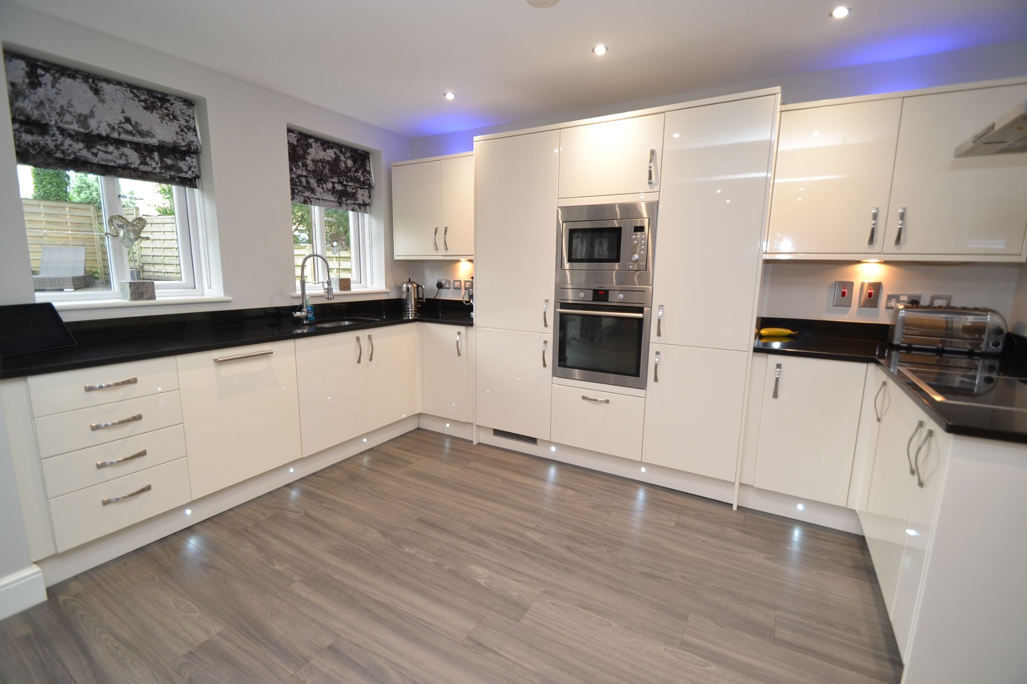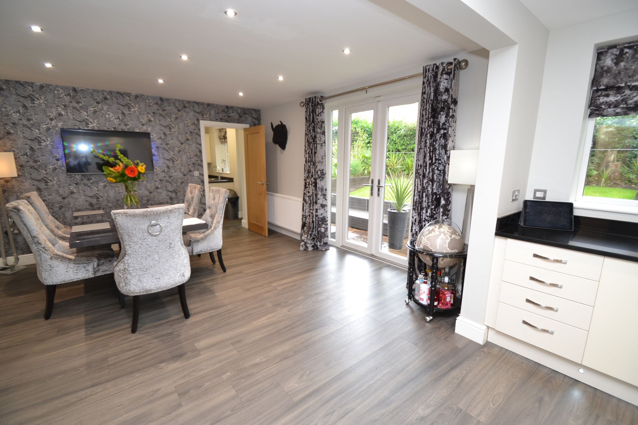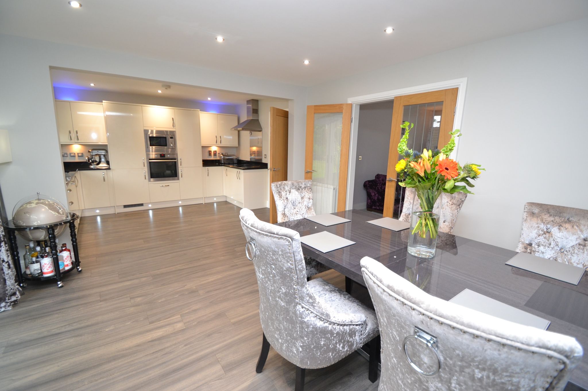 Open Plan Dining Kitchen Room: 8.4m x 6.9m (27'6 x 22'8). In the dining area this will accommodate a large table and chairs, rear Upvc dg French doors, laminate flooring continues from the hallway, inset ceiling lights, two radiators. In the Kitchen area there is an extensive range of wall & base units in high gloss by Howdens, granite work tops with matching splash backs, under lighting, integrated dishwasher and fridge freezer, induction hob, Neff extractor and stainless steel splash back, AEG stainless steel electric oven and microwave, led plinth lighting, Upvc dg windows to rear, wired in smoke alarm.