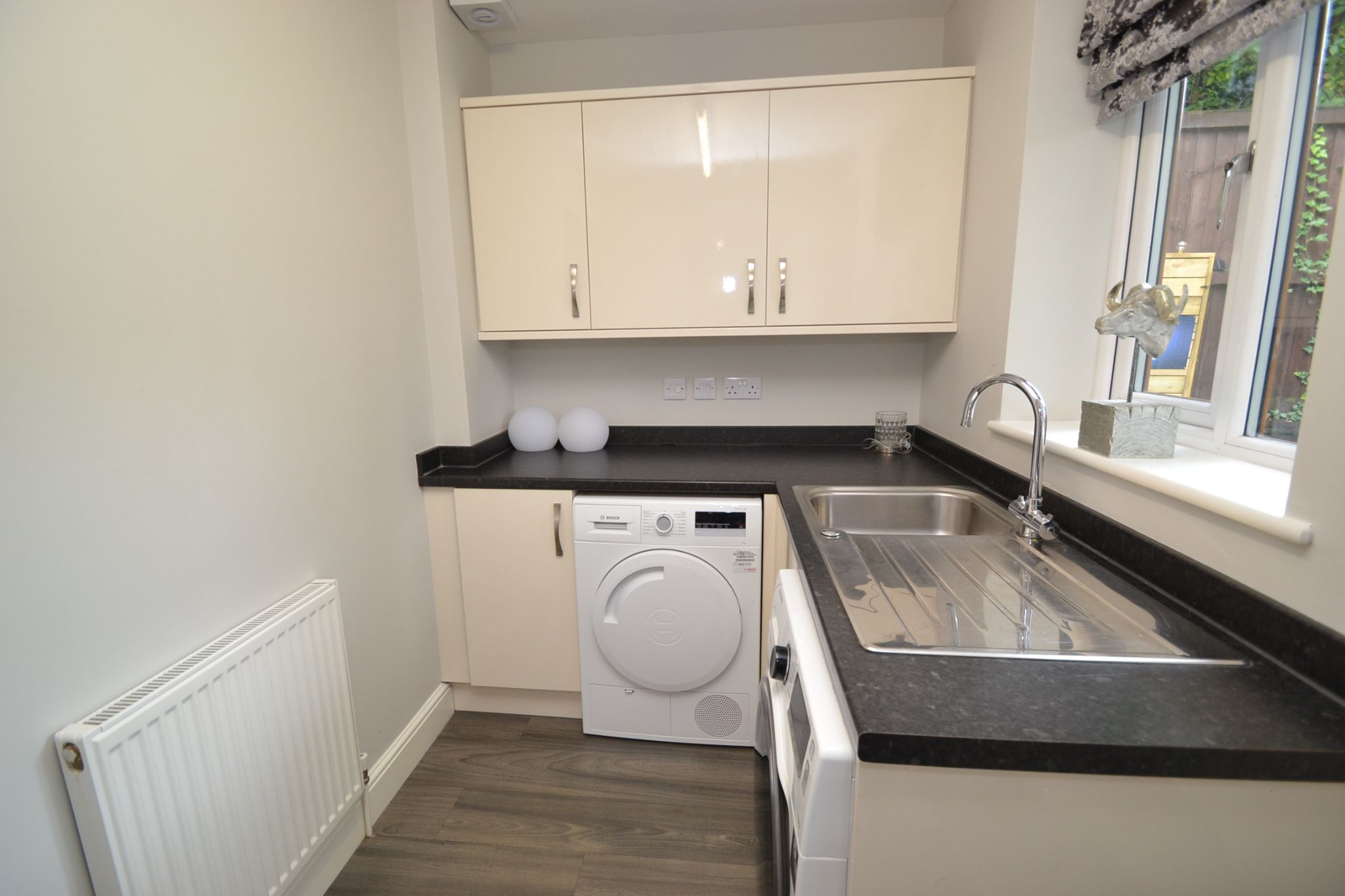 Utility Room: 3.0m x 2.1m (9'10 x 6'11). Range of wall & base units, work tops with splash backs, rear Upvc door and window, plumbed for an auto-washer and dryer, stainless steel sink, radiator, matching laminate floor, internal door leads into the:-