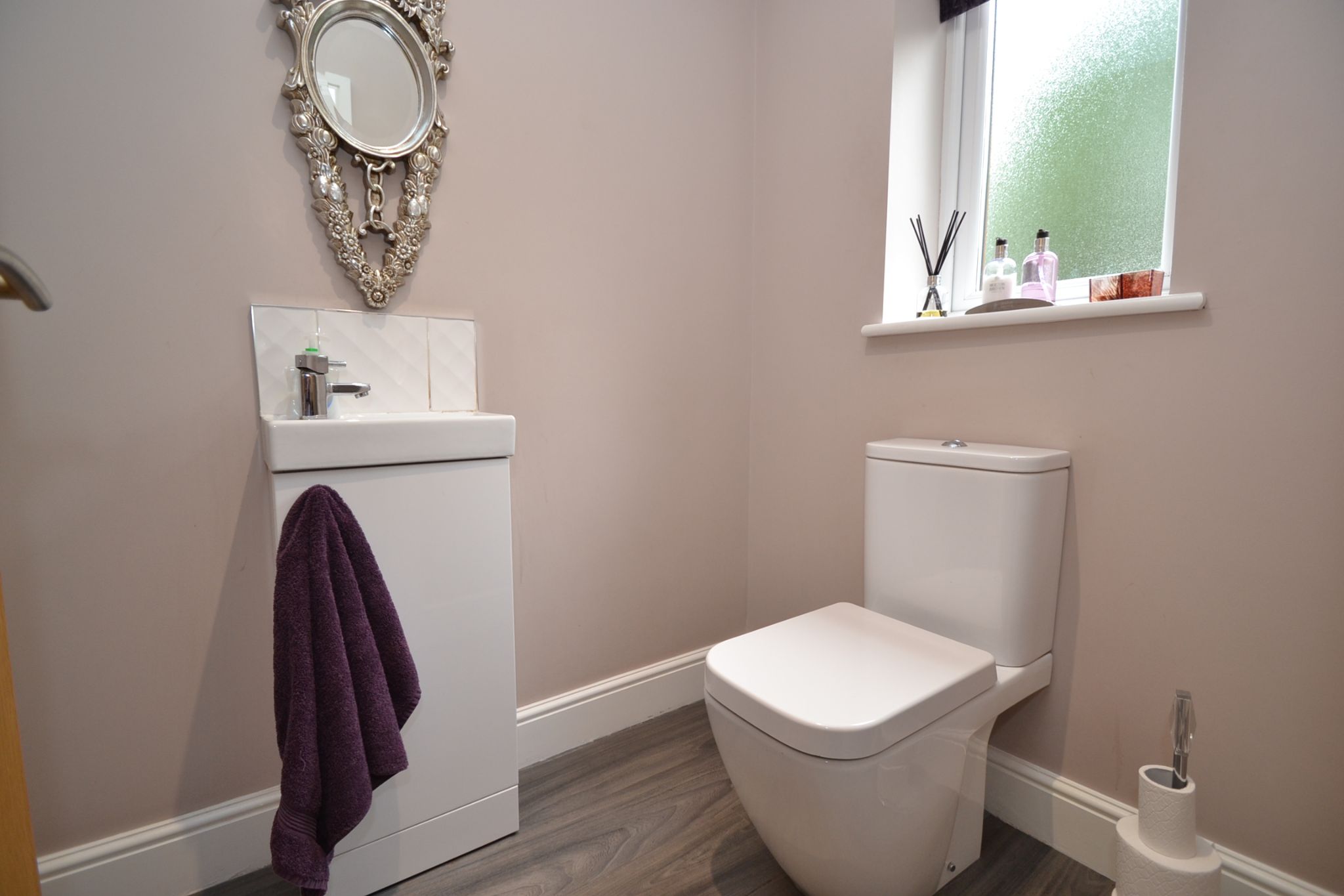 Cloaks wc: Wash basin on a vanity unit, wc, frosted Upvc dg window, radiator, extractor.