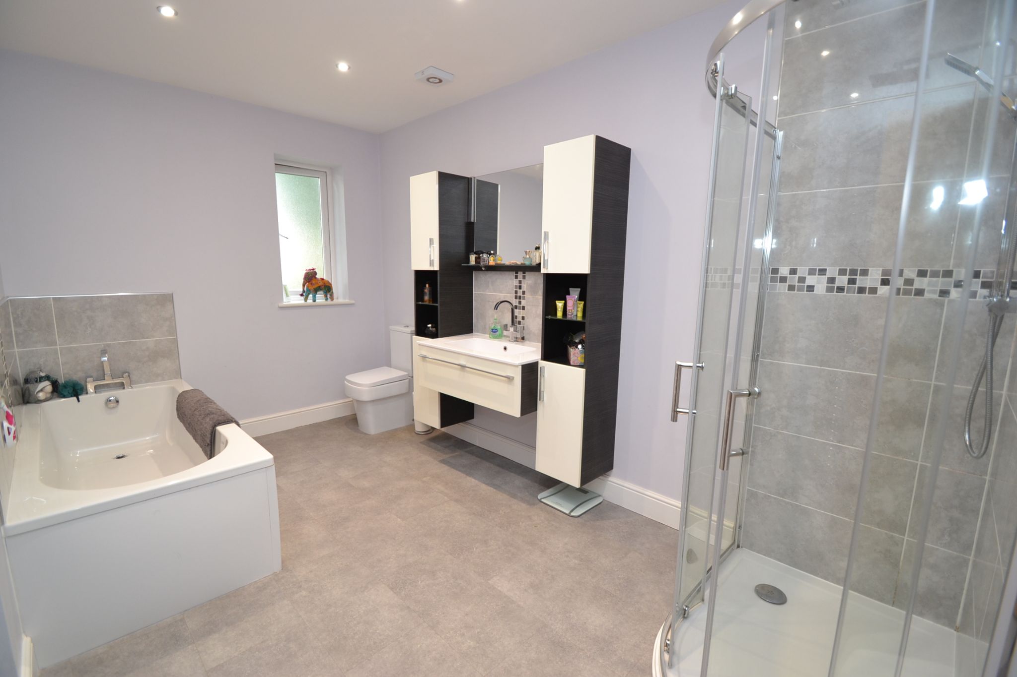 Bathroom: 4.1m x 2.7m (13'5 x 8'11). Contemporary wrap around shower cubicle with a chrome thermostatically controlled twin head shower unit, bath, wash basin and built in vanity cabinets, wc in white, frosted Upvc dg window, extractor, inset ceiling lights, large heated chrome towel rail.