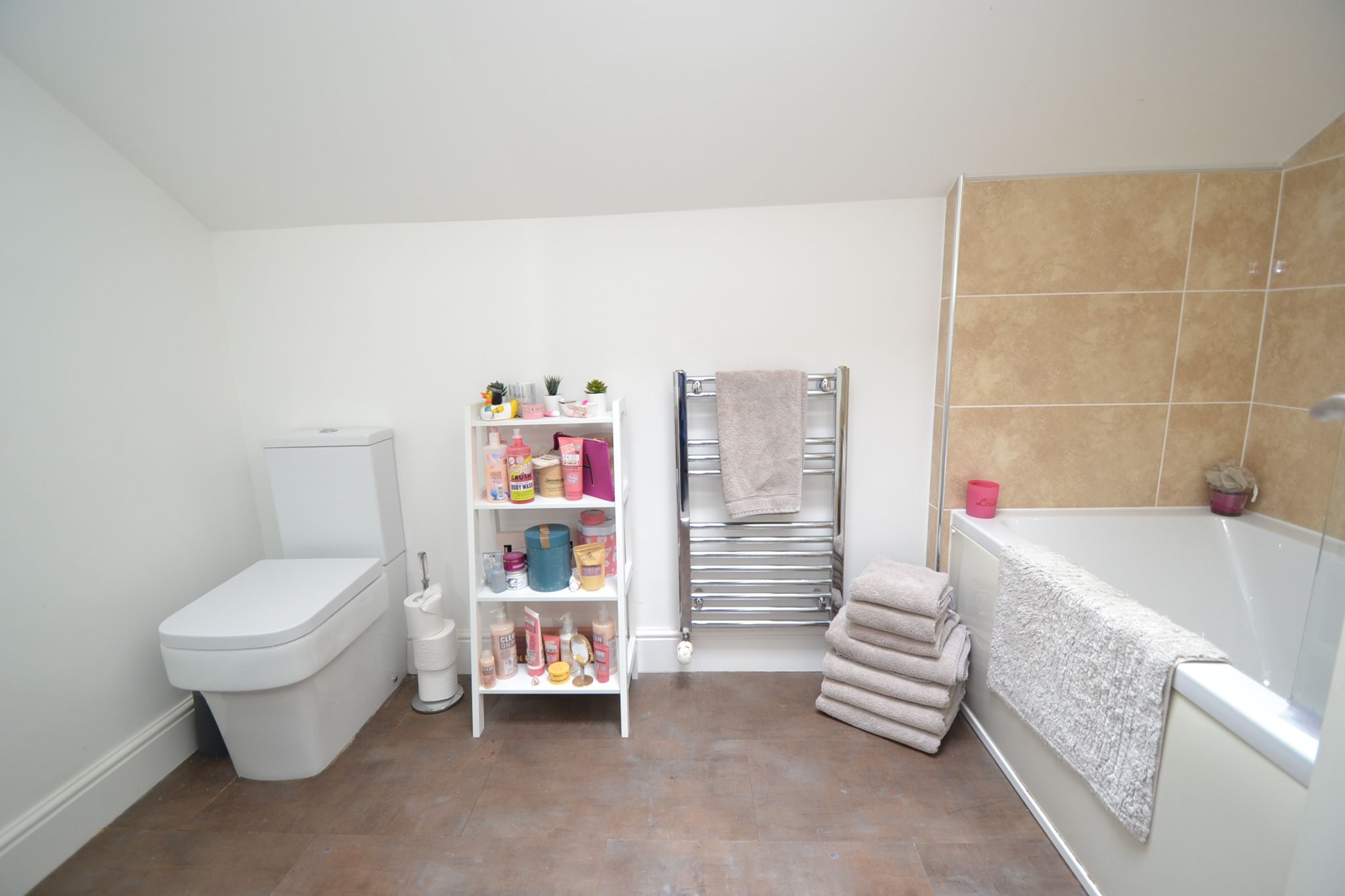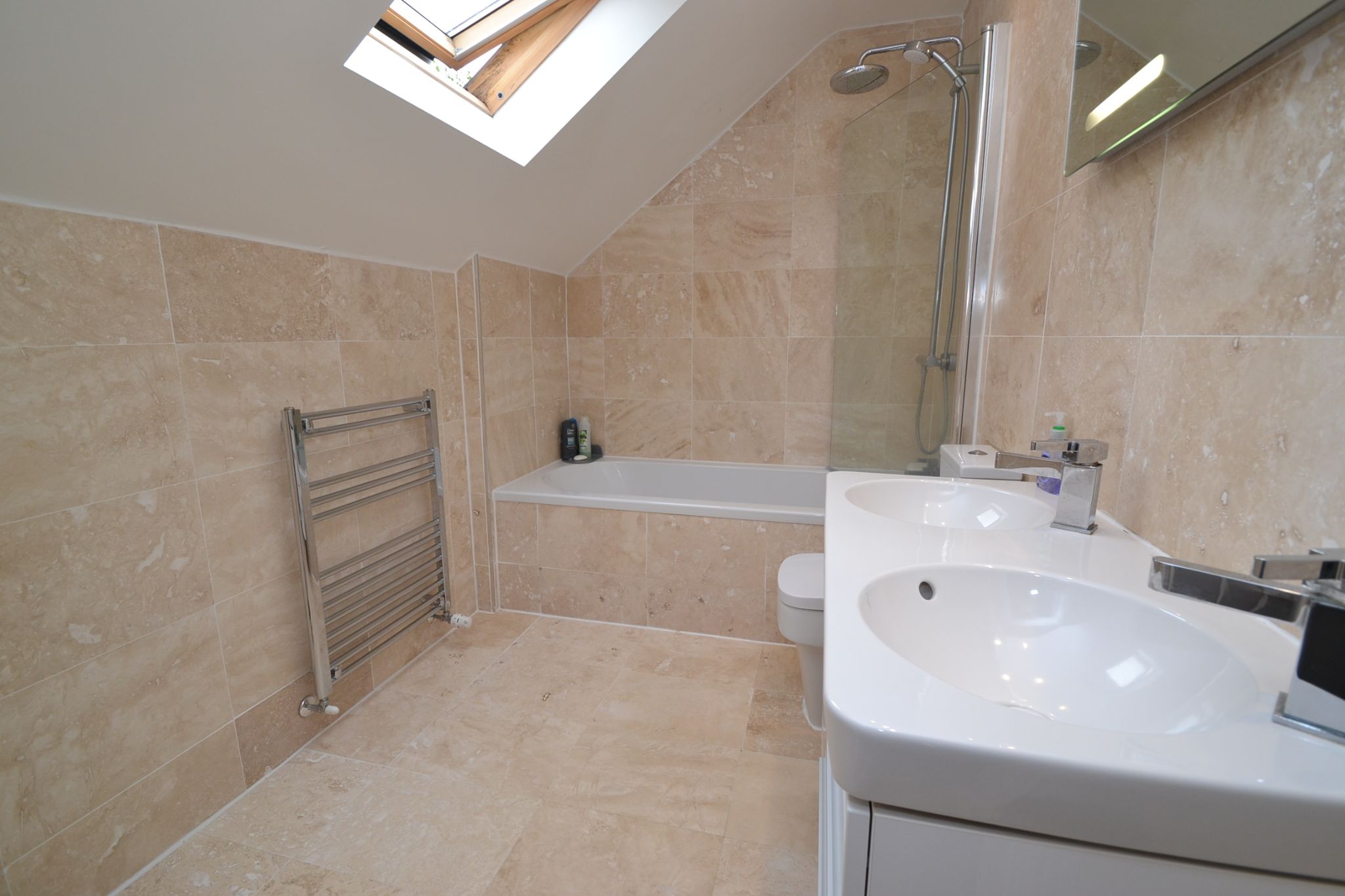 En-Suite: 3.0m x 2.6m (9'11 x 8'7). Three piece suite with bath, shower glass screen and thermostatically controlled shower unit, wash basin set on a vanity unit, wc in white, dg skylight velux, part tiled, heated chrome towel rail, extractor.
