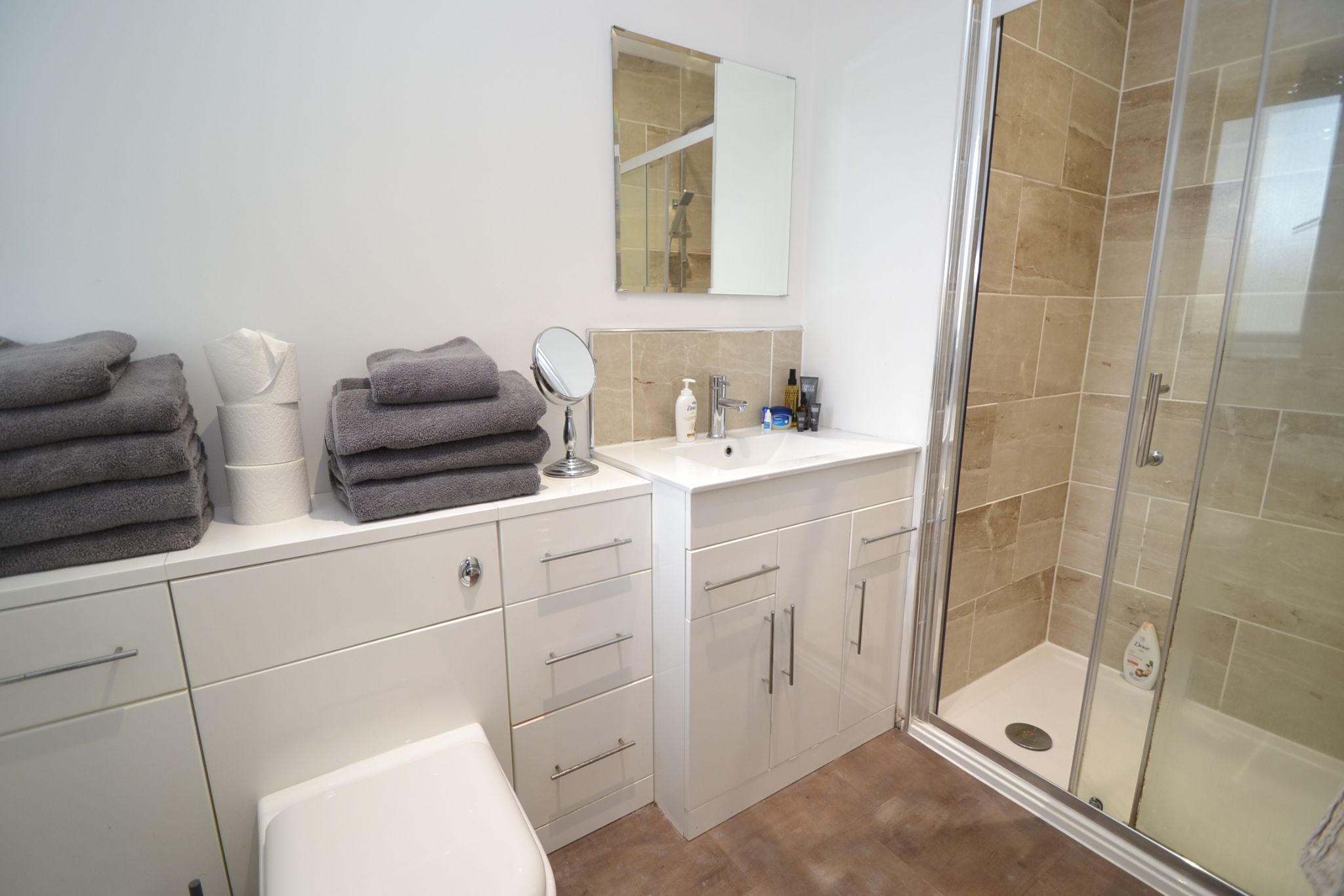 En-Suite: 2.0m x 1.8m (8'7 x 5'11). Fully tiled shower cubicle with a chrome thermostatically controlled shower unit, wash basin built in to an enclosed vanity unit, wc, frosted Upvc dg window, extractor, inset ceiling lights, heated chrome towel rail.