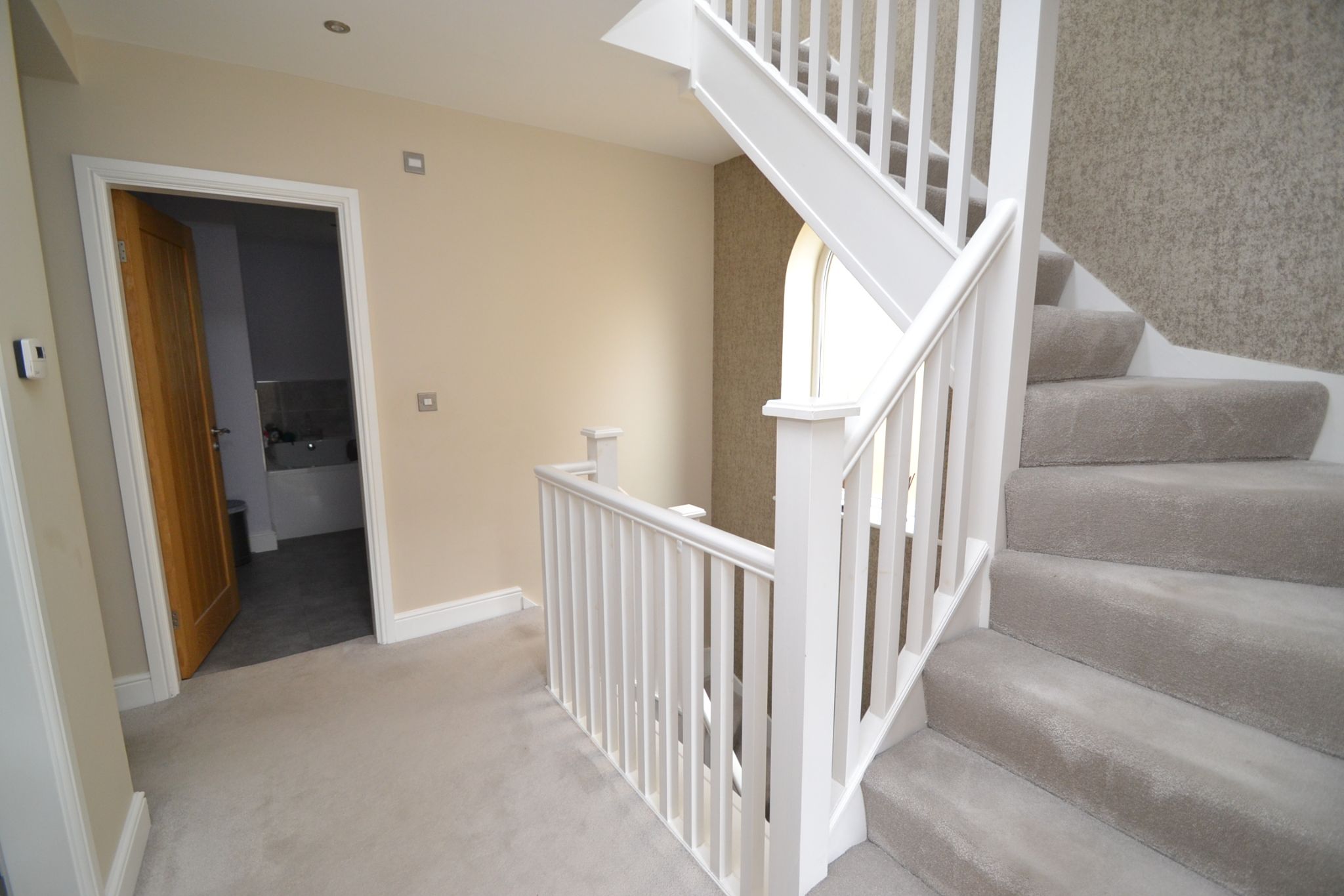 First Floor: Return spindle staircase, feature frosted Norman style archway window, radiator and Upvc dg window, spacious landing with useful linen cupboard.