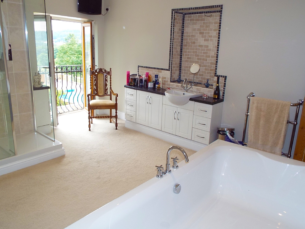 En-Suite Bathroom: 15'1 x 13'0. Rugby style freestanding bath in white with mosaic tiling, inset chrome ceiling lights, school type ch radiator with chrome towel rail, wash basin in vanity unit with rustic tiling, linen cupboard, double fully tiled shower cubicle with spider head and thermostatically controlled unit, TV point, extractor, Upvc dg French doors.