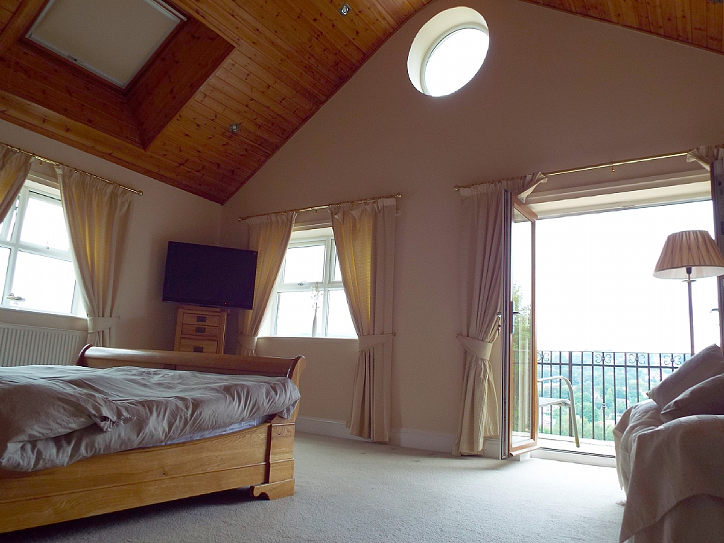 Bedroom 1: 20'4 x 14'8. Upvc dg French doors lead out onto the decked and stone balcony surrounding the property, extensive views, hot tub, feature apex pine roof with dg velux windows.