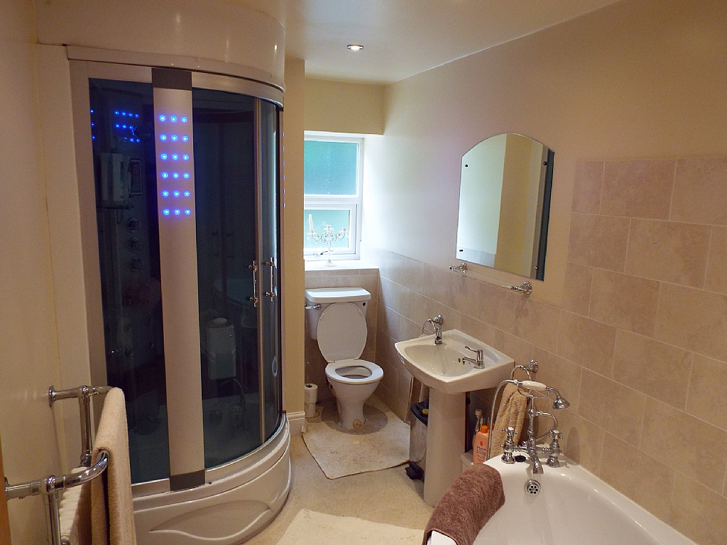 House Bathroom: 11'5 x 6'5. Three piece corner suite in white with chrome fittings, chrome inset ceiling lights, part tiled, school type ch radiator with chrome towel rail, contemporary wrap round shower cubicle with blue lighting, spa, steam and shower unit with built in radio, extractor.