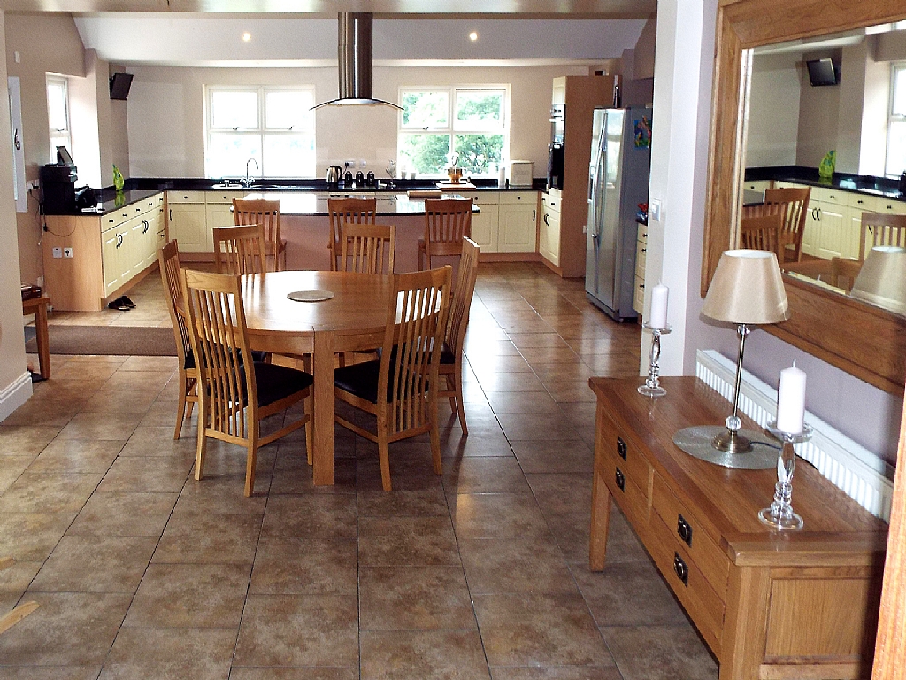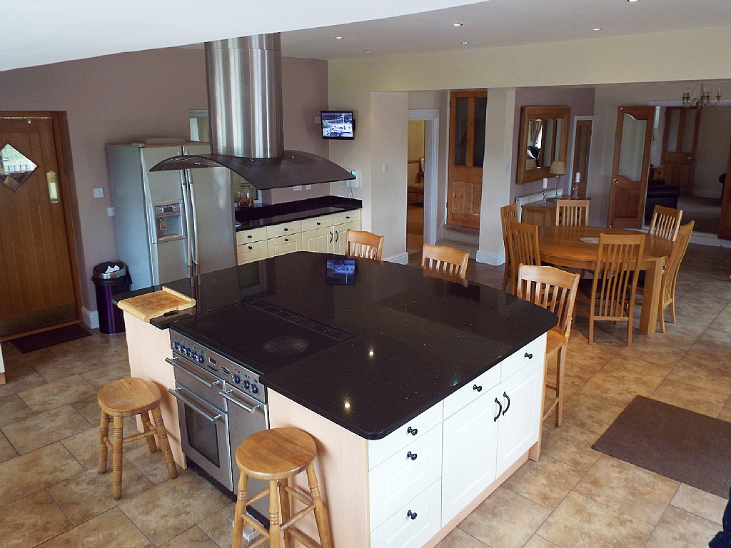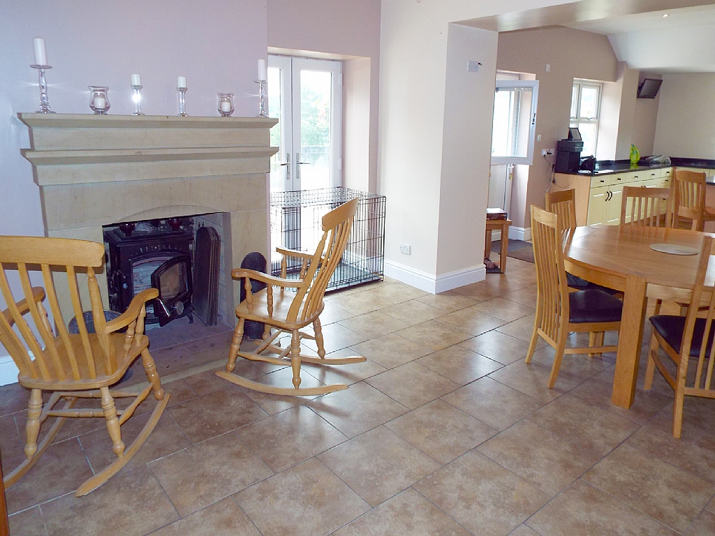 Kitchen Dining Room: 34'7 x 20'4. Range of units in shaker style cream, granite work surfaces, stainless steel bowl sink and drainer, built in electric double oven and grill, integrated dishwasher, central island with granite work surfaces & built in Range Master with 5 ring halogen hob, built in double oven, two grills, double stainless steel extractor hood over, tiled with approx 1/3rd of the floor surface with under floor heating, space for a tall boy fridge freezer, TV point and CCTV, intercom telephone, Upvc dg French doors along with separate entrance door. The dining area has a stone fireplace with a multi-fuel stove, door down to the cellar.
