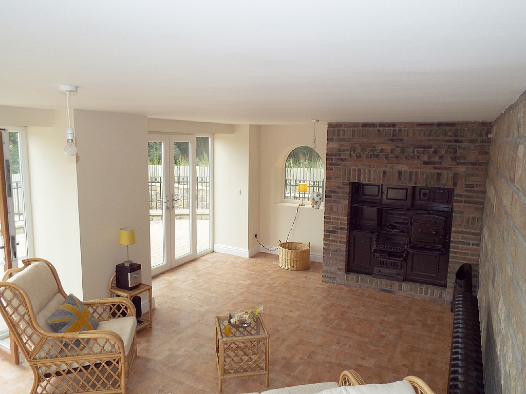 Lounge: 30'4 x 19'9. Upvc dg windows to side & rear, coving, down lighting, oak wood floor, Rayburn boiler, fireplace feature in marble and living flame gas fire, side Upvc dg French doors, built in Bose sound system, glazed doors lead onto: